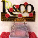 Soft pink holographic croc finish with elegant structure.